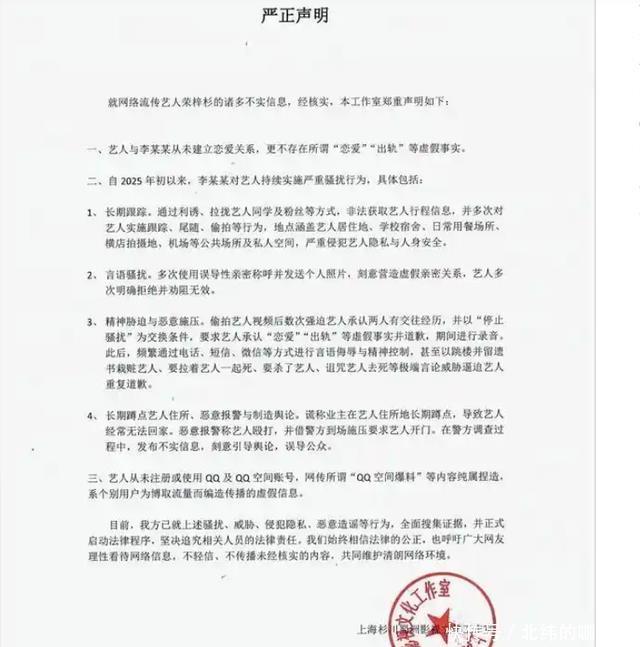 由于荣梓杉出轨打人事件,接连登上多个热搜榜单。 该工作室也赶紧对外发布声明,并否认了两人有恋爱的过往。 甚至扬言,对方谎称业主,长期蹲点艺人住所,想要强迫荣梓杉和她发生关系。 频繁通过各种联系方式,用跳楼、拉着艺人一起死等极端言论威胁。