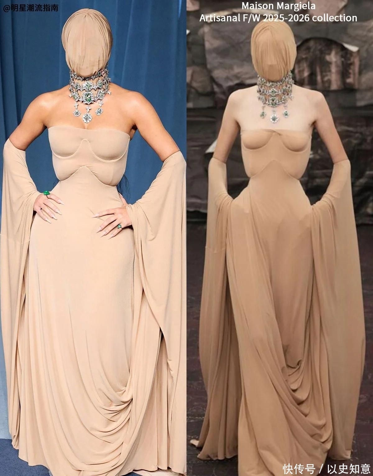 7. 她所穿着的这件裸色高定礼服,并非随意拼接的设计产物,而是深植于古埃及文明符号的一次现代演绎。其灵感直指传奇王后纳芙蒂蒂的形象重构。