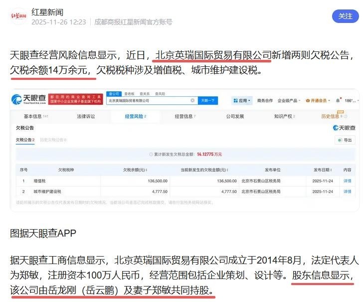 2025月,官方媒体披露一则岳云鹏欠税的消息,一时间引发大众舆论。